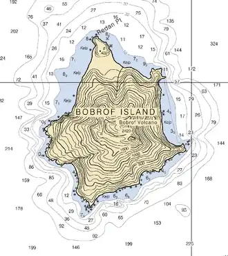 Bobrof Island (Aleut: Walĝa[3]) is one of the Andreanof Islands subgroup of the Aleutian Islands in southwestern Alaska, United States.[4] Bobrof Island is a small, uninhabited island about 9 miles (14 km) north and west of Kanaga Island, and 7 miles (11 km) northeast of Cape Sudak on Tanaga Island. Bobrof Island is 2.6 miles (4.2 km) long and 1.8 miles (2.9 km) wide with an area of 3 square miles (7.8 km2), and consists primarily of the 2,421-foot (738 m) high Bobrof Volcano.[4] The volcanic crater, or cone, has been heavily dissected.[5] Underwater deposits adjacent to the island's northeast flank suggest an immense debris-avalanche has taken place.[4]