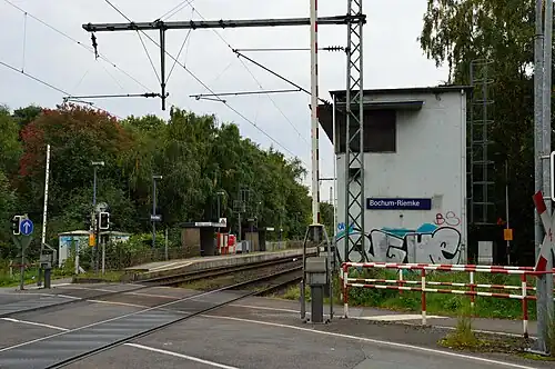Bochum-Riemke station (German: Haltepunkt Bochum-Riemke) is a railway station in the municipality of Bochum, North Rhine-Westphalia, Germany. The station has two side platforms, and is served by 80 Glückauf-Bahn regional trains per day (half of that on weekends). In addition, many freight trains run on the route, especially at night. It was originally named Bochum-Graetz, then Bochum-Nokia from 1993 to 2009.