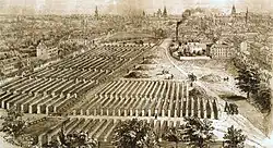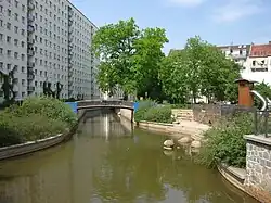 From about 1915, the Pleiße was heavily polluted by the introduction of untreated industrial waste water, so that between 1951 and 1956[16] the Pleißemühlgraben in the inner city area was arched up to the Goerdelerring and from there to the confluence of the Parthe in the Leipzig Zoo was filled in. Since then, the water from the Pleißemühlgraben has flowed via a short transverse channel at the former location of the Angermühle into the Elstermühlgraben in the neighbourhood of the Waldstraßenviertel, which from there is the former natural stream bed of the Parthe.