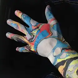 Hands and faces can be marbled temporarily for events such as festivals, using a painting process similar to traditional paper marbling, in which paint is floated on water and transferred to a person's skin. Unlike the traditional oil-based technique for paper, neon or ultraviolet reactive colours are typically used, and the paint is water-based and non-toxic.[36][37]