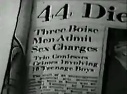 The first arrests in the scandal came on October 31, 1955, following an investigation by private detective Howard Dice at the behest of an unnamed client.[2] Those arrested were Ralph Cooper, a 33-year-old shoe repairman; Charles Brokaw, a 29-year-old freight worker; and Vernon Cassel, a 51-year-old store clerk.[3] Cooper and Brokaw were charged with "lewd conduct with a minor child" (Cooper based on an incident from June 1954) and Cassel with "infamous crimes against nature",[4] in other words, sodomy. When the arrests were announced, Ada County Probation Officer Emery Bess stated, without offering supporting evidence, that the investigation had only "scratched the surface" of "child molestation activities" in Boise involving several adults and over 100 teenagers.[3]