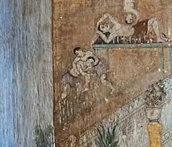 Bokator as practised today represents a modern form of the martial art used by Khmer soldiers during the Angkor period (9th–15th century) and depicted in carvings and bas-reliefs found throughout the Angkor temples.[17][18][19] Many bas-reliefs show groups of soldiers at the entrance or in the outbuildings of palaces engaging in martial arts matches.[20] A large number of the arm-locks, hand-locks and neck-locks used in Bokator are depicted on the walls of Bayon temple.[21]