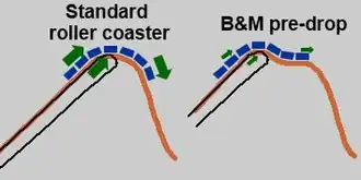 Early Bolliger & Mabillard coasters feature an element known as a "pre-drop", a short drop after the top of the lift hill and before the start of the first drop, designed to reduce stress on the lift chain. The flat section between the pre-drop and the first drop serves as a shelf to support the weight of the train, reducing related stresses on the chain. On most coasters without a pre-drop, the weight of the train tends to pull on the lift chain as it begins its descent because the latter half of the train is still being lifted by the chain. Pre-drops have not been used on the company's Dive or Flying coasters, or on hyper coasters built after 1999.[26][27] OzIris at Parc Astérix was the first B&M inverted roller coaster that does not feature a pre-drop.[28] Ever since, no coaster built by B&M has featured a pre-drop[29][30] because the chain accelerates to acquire the same speed as the train when it is being taken over by gravity after it passes the crest.