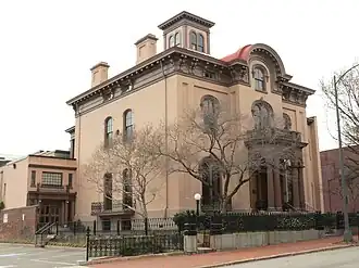 Bolling Haxall House, also known as the Woman's Club, is a historic residential building located in Richmond, Virginia. It was built by Bolling Walker Haxall in 1858 and is a three-story Italian Villa style dwelling of sandstone-colored stucco, scored to imitate ashlar. It features a projecting central entrance on the front facade, a raised portico (with arched openings) supported by four fluted columns, and an elaborate double-bracketed, dentiled cornice. An auditorium was added in 1916, after the home's acquisition by the Woman's Club in 1900.[3]