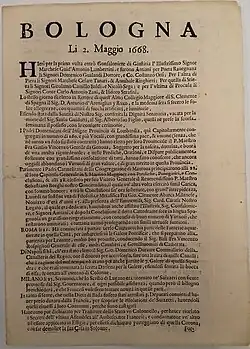 - ^ Biancini, Bruno (September 1936). "Trecento anni di giornalismo a Bologna, 1 Dagli avvisi seicenteschi all'epoca napoleonica". Bologna, Rivista del Comune (in Italian). No. 9. Bologna. pp. 23–34.