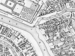Lower Yauza river had numerous bridges, dams and water mills since Middle Ages. The 1853 city plan shows a total of four such crossings. One was eventually demolished without replacement, three others correspond (west to east) to present-day Maly Ustinsky, Astakhovsky (Yauzsky) and Tessinsky bridges. Most important of these, Yauzsky Bridge, connecting city center with eastbound roads, was rebuilt in stone in 1804. In 1812, it was in the path of retreating Russian Army when it evacuated Moscow after Battle of Borodino.[4] Yauzsky Bridge was renamed Astakhovsky after I.T.Astakhov, a steelworkers' leader killed on the bridge during a rally on February 28, 1917; this title remains official to date.[5]