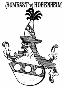 Bombast von Hohenheim was a Swabian noble family from the 12th century, named for their seat, Hohenheim Castle, which they held as a fief from the Counts of Württemberg. Their coat of arms was blazoned Or on a bend azure three roundels argent.