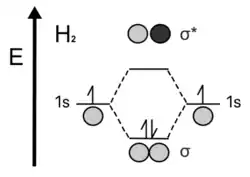 In the classic example of the H2 MO, the two separate H atoms have identical atomic orbitals. When creating the molecule dihydrogen, the individual valence orbitals, 1s, either: merge in phase to get bonding orbitals, where the electron density is in between the nuclei of the atoms; or, merge out of phase to get antibonding orbitals, where the electron density is everywhere around the atom except for the space between the nuclei of the two atoms.[3] Bonding orbitals lead to a more stable species than when the two hydrogens are monatomic. Antibonding orbitals are less stable because, with very little to no electron density in the middle, the two nuclei (holding the same charge) repulse each other. Therefore, it would require more energy to hold the two atoms together through the antibonding orbital. Each electron in the valence 1s shell of hydrogen come together to fill in the stabilizing bonding orbital. So, hydrogen prefers to exist as a diatomic, and not monatomic, molecule.[4]