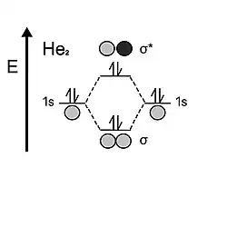 When looking at helium, the atom holds two electrons in each valence 1s shell. When the two atomic orbitals come together, they first fill in the bonding orbital with two electrons, but unlike hydrogen, it has two electrons left, which must then go to the antibonding orbital. The instability of the antibonding orbital cancels out the stabilizing effect provided by the bonding orbital; therefore, dihelium's bond order is 0. This is why helium would prefer to be monatomic over diatomic.[5]