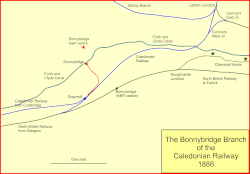 A more convenient station for Bonnybridge was opened on 2 July 1888, when the Kilsyth and Bonnybridge Railway opened. This offered better passenger connections, but more importantly at the time, a more convenient location for goods and mineral traffic inwards and outwards. Bonnybridge now had three stations.[9]