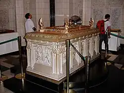 The display case for the first book was designed by John A. Pearson, architect of the Peace Tower, and made by Bromsgrove Guild Limited (Great Britain) and Robert Mitchell Company in 1928. Made of bronze, enamel and other metals, it is decorated with four kneeling angels and a ribbon encircling a laurel.[3] It rests on an altar of English Hoptonwood limestone that was a British gift to Canada, situated at the centre of the chamber.[2] Later books are displayed on altars of Hoptonwood stone and bronze, decorated with poppies, located against the walls of the chamber.[2]