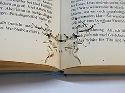 True book-borers are uncommon. The primary food sources for many "bookworms" are the leather or cloth bindings of a book, the glue used in the binding process, or molds and fungi that grow on or inside books. When the pages themselves are attacked, a gradual encroachment across the surface of one page or a small number of pages is typical, rather than the boring of holes through the entire book.[3]