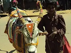 A Boom Boom Ox (Tamil: பூம் பூம் மாடு) is a decorated ox used in Tamil Nadu, India for fortune-telling by the Boom Boom Mattukaran tribe. These oxen are decorated with jewellery, bells and bright cloth and are led by fortune tellers to individual houses or places where people gather. The patron usually stands in front of the ox and the fortune teller. The fortune teller asks the ox questions in a sing-song voice about the future of the patron. The Ox is trained to nod yes or no for the questions and from its head nods, the fortune teller tells the fortune of the patron. The term "Boom Boom Ox" is also used an insult in Tamil to denote a yes man or a weak willed person.[1]