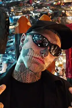 The video features full-bodied tattooed model Rick Genest (Rico), better known by his stage name Zombie Boy.[97] Gaga painted her face in a similar way to Genest, in one of the main series of sequences. She said that the sequences displayed the fact that she would not allow society or critics to dictate her sense of beauty. "I tell you what I think is beauty, and hence the scene was of me and Rico defining ourselves in artistic way and not relying on society to dictate it," she added.[98] The costumes for the video were designed by Formichetti, who blogged about the various designer pieces shown in it. In the opening sequence of the video, Gaga wore a head accessory by Alexis Bittar, a diamond neckpiece by Erickson Beamon with earrings by Pamela Love, and a stained-glass dress by Petra Storrs. Finger rings were provided by Erickson Beamon and chiffon clothes by Thierry Mugler. For the skeletons sequences, both she and Rico wore tuxedos by Mugler while the slime during the orgy scenes were courtesy of Bart Hess. For her Michael Jackson impression in the alley at the video's end, Gaga wore shirt and pants designed by her creative team, the Haus of Gaga, shoes by Natacha Marro, a Billykirk belt and LaCrasia gloves.[99]