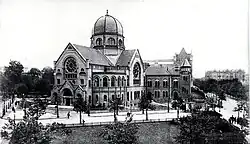 In 1902, the plot of land for construction was purchased by the community for 90,459 Marks.[10] Its construction began un 1904, and its capacity was set to hold 1,200 people.[11] It was designed by architect Semmy Engel and master builder Ernst Friedheim.[12] The two plans were initially submitted separately by them, and then were merged into one plan for collaboration. On September 13, 1906, the new building was opened as a synagogue, and the then-Chief Rabbi Markus Hirsch gave a commemorative sermon.