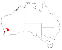 Barbalin boronia grows in scrub and heath, on flats and road reserves in the Avon Wheatbelt and Coolgardie biogeographic regions, approximately between Beacon, Trayning and Mount Marshall.[2][7][8]
