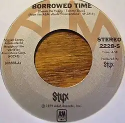 "Borrowed Time" is a song written by Dennis DeYoung and Tommy Shaw that was first released on Styx's 1979 album Cornerstone and was also released as the third single from Cornerstone. It peaked at No. 64 on the U.S. chart in April 1980.