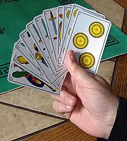 Botifarra (Catalan pronunciation: [butiˈfarə]) is a point trick-taking card game for four players in fixed partnerships played in Catalonia, in the northeast of Spain,[1] and parts of Aragon, the Balearic Islands[2] and North of the Valencian Country. It is a historical game also played in many parts of Spain, not only in bars and coffee shops.[3] The game is closely related to Manille from which it takes the mechanics, but its rules induce deduction and minimise the effects of luck.