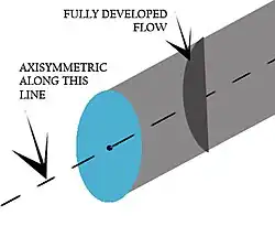 In this boundary condition, the model is axisymmetric with respect to the main axis such that at a particular r = R, all θs and each z = Z-slice, each flow variable has the same value.[3] A good example is the flow in a circular pipe where the flow and pipe axes coincide.