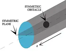 In this boundary condition, it is assumed that on the two sides of the boundary, same physical processes exist.[4] All the variables have same value and gradients at the same distance from the boundary. It acts as a mirror that reflects all the flow distribution to the other side.[5] The conditions at symmetric boundary are no flow across boundary and no scalar flux across boundary.