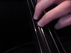 The strings can be struck with the hand or with another object to produce a loud ringing or percussive sound. The performer's right hand is often used for this which leaves the left hand free to finger pitches or dampen the strings.