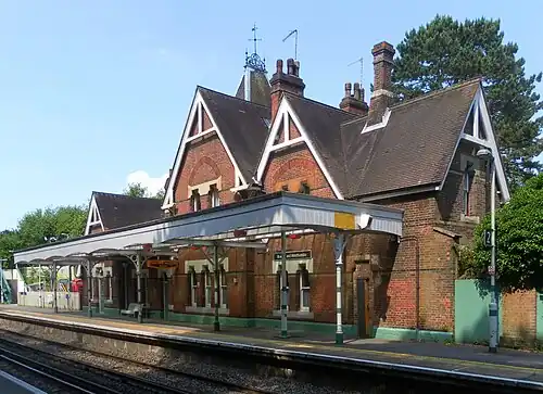 The station was constructed at the insistence of Thomas Grissell the owner of Norbury Park, in part compensation for the railway cutting across his land to the north of the village. The main building was designed by Charles Henry Driver[6] in the Châteauesque style and included steeply pitched roofs with patterned tiles and an ornamental turret topped with a decorative grille and weather vane.[7] The building is currently in use as a private dwelling and commercial premises and is protected by a Grade II listing.[1]