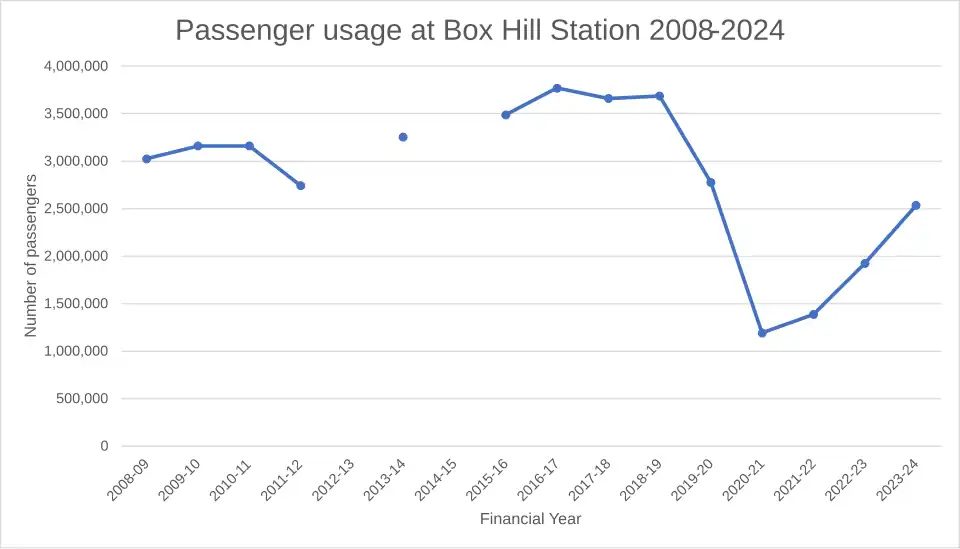 During the 2017/2018 financial year, with 3.254 million passenger movements, Box Hill was the tenth-busiest station on Melbourne's metropolitan network, as well as being the busiest non-interchange station outside of the Melbourne CBD.[9]