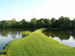 Land bridge over the pond.