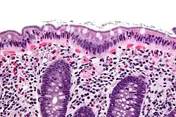 B. pilosicoli attaches in an end-on manner to the mucosal epithelium of the large intestine and interferes with water absorption in the GI tract.[7] This end-on attachment creates the appearance of a "false brush border" and is a common feature of spirochetosis in all animal species.[4] Inflammation of the mucosa due to spirochete attachment may lead to a thickened mucosa, focal lesions with an exudate of mucus and white blood cells, and dilated colonic crypts.[7] This disruption to the colonic enterocytes and associated microvilli causes the symptoms of diarrhea and slow growth that are characteristic of intestinal spirochetosis.[7]
