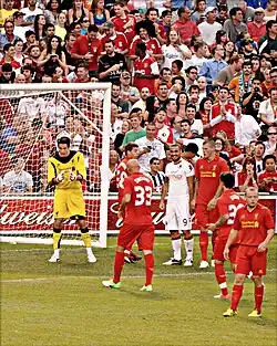 On 17 August 2010, Jones joined Liverpool in a deal worth £2,300,000. He qualified as a "home-grown" player under the new Premier League rules.[8] On 19 August, Jones watched Liverpool's UEFA Europa League play-off 1st leg tie at Anfield from the directors' box, along with captain Steven Gerrard, Emiliano Insúa, Alberto Aquilani and Dirk Kuyt. He was handed the number 1 shirt after goalkeeper Diego Cavalieri left the club on 23 August, ahead of Liverpool's clash with Manchester City. Jones made his unofficial debut in Jamie Carragher's testimonial against an Everton XI and impressed with a string of saves.[9] Jones made his debut for Liverpool in the League Cup 3rd Round tie against Northampton Town on 23 September 2010. The game ended 2–2 after extra time before Liverpool lost on penalties. A couple of weeks later, Jones injured his shoulder in training and was out for up to a month. Reserve goalkeeper Martin Hansen took his place on the bench until Jones was back fit, as Liverpool's other backup goalkeeper Péter Gulácsi was on loan at nearby club Tranmere Rovers. He made his second start for the club on 15 December 2010, in a Europa League game against Utrecht, getting his first clean sheet for the Reds. Unfortunately for Jones, this was to be his last game of the 2010–11 season.
