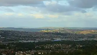 ![]() An image looking north eastwards across Bradford and Bradford Dale. The dale extends across the middle foreground from left to right (where the warehouses are) and then changes direction to go back to the left around Manningham Mills (the very tall chimney in the middle). The steep sides of Airedale are the hillsides in the distance | |