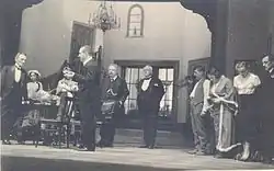 Nušić returned to Serbia a broken man, devastated by the loss of his only son.[17] He was appointed to be the first head of the Ministry of Education's art department, serving alongside the writers Borisav Stanković and Stanislav Vinaver.[18] He also became the first post-war director of the theatre in Skopje.[14] He remained at this post until 1923. Afterwards, he was appointed head of the Sarajevo National Theatre.[19] In Sarajevo, Nušić wrote Ramazanske noći (Nights of Ramadan) under the pseudonym Halil Delibašić. He returned to Belgrade in 1927. In Vienna, he acted in the film Paramount Review in 1930. Nušić became a member of the Serbian Royal Academy in 1933.[20] Following The Bereaved Family's 1935 premiere in Sofia, he received a medal from the Bulgarian state. He was also awarded Order of Saint Sava, Order of the White Eagle and Order of Prince Danilo I.[21] Nušić died in Belgrade on 19 January 1938.[22]