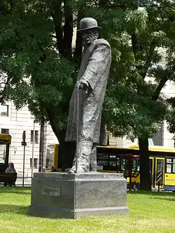 Following Austria-Hungary's annexation of Bosnia and Herzegovina in October 1908, Nušić led a series of anti-Habsburg demonstrations in Belgrade. He climbed a balcony at the National Theatre, railed against the "plunder" of Serbian lands by Austria-Hungary, and demanded immediate military action.[11] He subsequently rode his horse into the Ministry of Foreign Affairs, to the consternation of Prime Minister Nikola Pašić.[12] The popularity of Nušić's works, as well as those of fellow dramatist Petar Kočić, increased dramatically following the annexation.[11] In 1912, Nušić returned to Bitola as a civil servant. Macedonia was captured and annexed by Serbia following the First Balkan War, and in February 1913, Nušić was appointed prefect of Bitola. He was quickly forced to resign after consistently failing to adhere to the demands of the Black Hand and the ultra-nationalist guerilla bands that formed the backbone of the Royal Serbian Army's occupation force.[13] Despite this, he remained in Skopje, and helped establish the city's first theatre in 1913.[14] The outbreak of World War I brought further personal tragedies Nušić's way; his son Strahinja was killed on the frontline while serving in the Serbian Army.[15] Nušić lived in Skopje until November 1915, when Austria-Hungary, Germany and Bulgaria successfully invaded and occupied Serbia. He took part in the Serbian army's retreat through Albania between November 1915 and February 1916.[16] He lived in Italy, Switzerland and France until the end of the war.[9]
