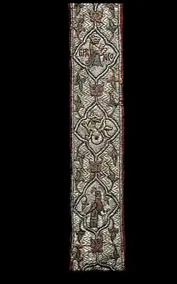 On the preserved parts of the gold embroidery called "Branko's Belt" (Brankov pojas), taken to have been ordered by Branko, a helmet with a crest of a rising lion is depicted, along with the name Branko.[18] The lion, as a motive of monarchial iconography in Serbia, appears in coinage of Stefan Dušan and Stefan Uroš V, and in an independent presentation in a seal of the latter.[19] The lion then disappears from the repertoire of Stefan Uroš V, but is maintained by the Branković family, in various forms.[19] S. Novaković found one fragment of the belt in the collection of the Russian archaeological commission.[20]