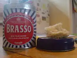 Brasso is a metal polish designed to remove tarnish from brass, copper, chrome and stainless steel. It is available either directly as a liquid or as an impregnated wadding pad also known as Duraglit.