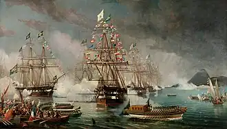 By 1840 the Brazilian government began organizing the fleet that would sail to Naples in order to bring empress Teresa Cristina of the Two Sicilies to Brazil. Constituição was assigned to the fleet under the command of captain of sea and war José Ignácio Maia. The frigate was richly decorated with Brazilian imperial insignia and furnished with luxurious items, such as mirrors, paintings, gold carving, and marble. The other ships of the fleet consisted of the corvettes Euterpe and Dois de Julho. The fleet departed for Europe on 5 March 1843, under the command of Theodoro Alexandre de Beaurepaire. The ships arrived in Naples on 22 May 1843.[11] On 1 July 1843 the empress went aboard Constituição, being greeted with a 21 shot salvo. The fleet set sail for Brazil the next day, also bringing aboard diplomatic officials and the empress' maids and servants. It was escorted by the Neapolitan ships Vesuvio, Partenope, Isabela, and Amalia.[12] The fleet arrived in Rio de Janeiro in the afternoon on 3 September 1843, being greeted by cannon salvos and the city's inhabitants. The empress disembarked with her entourage the next day.[13]