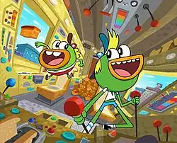 SwaySway, tall, thin and green, is the leader of the duo, and although he does not always use the best judgment, he is quite skilled at flying the van. Buhdeuce, short, round and green, is klutzier, but is also an enthusiastic and a loyal assistant to SwaySway. Often, when they get in over their heads, they will "level up", or transform (in a similar vein to video game characters) into a variety of forms they need to solve their problems.