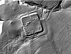 The fort is now part of the village green of Rochester, but there are still remains to see. The west wall is the best preserved and consists of a nine-feet-high bank with stone facing. The west gate is complete to the springing of the arch. However, much of the stonework has been plundered over the years for local buildings.