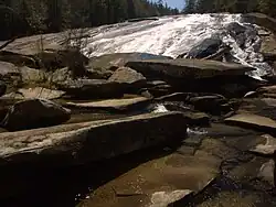 The waterfall begins as a slide which drops over a ledge approximately 4 feet (1.2 m) high. The river then continues down a long, sloping, ever-steepening granite slope before plunging into some small pools or against large rock slabs at the bottom. A portion of the river drops off a 25' cascade on river left at the bottom.