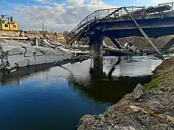 Two rail bridges over the Irpin river were damaged on 5 March 2022 by Russian artillery and destroyed on 21 March 2022 in a collapse. The first bridge was repaired by 7 May 2022,[47] the second bridge was repaired by November 2022.[48]