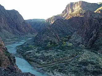 The confluence of the creek with the Colorado River flows through eroded canyons and debris of one of the base units of Granite Gorge on the river, the Vishnu Shist.