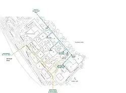 The central courtyard formed by the building group is a compact light, airy space. The pathways between the buildings provide visual and physical links with the courtyard and with the other buildings. The position of building entrances and corridors indicate the proposed circulation patterns that connect the buildings as a group.[1]