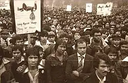 On 4 May 1978, Altab Ali, a 24-year-old Bangladeshi leather clothing worker, was murdered by three teenage boys as he walked home from work in a racially motivated attack.[28] The murder took place near the corner of Adler Street and Whitechapel Road, by St Mary's Churchyard.[20][25] This murder mobilised the Bangladeshi community in Britain. Demonstrations were held in the area of Brick Lane against the National Front,[29] and groups such as the Bangladesh Youth Movement were formed. On 14 May, over 7,000-10,000 people, mostly Bangladeshis, took part in a demonstration against racial violence, marching behind Altab Ali's coffin to Hyde Park.[30][31][32] Some youths formed local gangs and carried out reprisal attacks on their skinhead opponents (see Youth gangs).