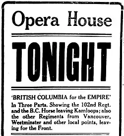 - ^ Inland Sentinel [Kamloops] (1916). "Opera House Tonight" [ad], Feb. 16, 4.