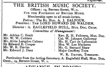 - ^ A. Eaglefield Hull. ' A Few Words about the British Music Society', in The Musical Times, 1 February 1919, p. 71