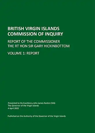 The British Virgin Islands 2021 Commission of Inquiry was a public inquiry commissioned by the then Governor of the British Virgin Islands, Augustus Jaspert.[1] The terms of reference were to make "a full, faithful and impartial inquiry into whether there was information that corruption, abuse of office or other serious dishonesty in relation to officials, whether statutory, elected or public, may have taken place in recent years; if there were such information, to consider the conditions which allowed such conduct to take place and whether they may still exist; and, if appropriate, to make independent recommendations with a view to improving the standards of governance and the operation of the agencies of law enforcement and justice in the Territory".[2][3]