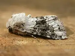 P. serena Schiff. (= placida Esp., hieracii Scriba, bicolorata Led., intermedia Walk. (17 f)). Forewing bluish grey, the median area dark olive fuscous; claviform stigma black-edged; upper stigmata pale grey with dark centres; hindwing whitish grey, — in female darker, — with veins and marginal border fuscous; — in leuconota Ev. (? = monticola Dup.) (17f) the base and outer area of forewing and the head and thorax are pure white; this form occurs in S. E. Russia, and is the prevalent form in Britain; the pale specimens with the marginal area well-marked are differentiated by Spuler as ab. leucomelaena, while albicans Spuler. applies to the rare cases in which the central field as well is broken up by white: — obscura Stgr. (17f) represents a very uniform dark grey aberration. — Larva yellowish green or brown, with dark blotches along dorsal and subdorsal regions; spiracular line yellow, distinct; head greenish yellow; feeds on flowers of various Compositae, Hieracium, Sonchus, etc. [1]