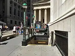 This station has three entrance and exit areas, with eight total stairways. The full-time entrance/exit is at the north end above the platforms. Two staircases from each side go up to a mezzanine containing a turnstile bank and station agent's booth. Outside of fare control, two street stairs go up to the southeastern corner of Wall and Broad Streets (outside 23 Wall Street).[53] Two more street stairs go up to the southwestern corner of the same intersection and lie outside of the New York Stock Exchange Building (NYSE). After the September 11 attacks in 2001, the stair facing away from Wall Street was closed off by the New York City Police Department, which had instituted a security zone around the NYSE.[5][52] In 2012, the stair facing towards Wall Street was closed when the security zone was reorganized.[54] In 2017, the two exits were proposed to be sealed as part of general improvements in that area, but no action was taken.[55] In 2019, the MTA again proposed permanently closing and removing the stairways to allow the NYSE to improve the streetscape just outside the building.[54]