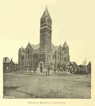 Broadway Methodist Tabernacle was a prominent Methodist church in Toronto, Ontario, Canada, that existed from 1872 to 1924. The congregation was originally housed in a wood chapel at the intersection of Spadina Avenue and Dundas Street, which at that time was known as St. Patrick Street. It was originally named the Spadina Avenue Methodist Church. Rapid growth in the congregation saw it seek a new home, and in 1876 a larger lot was purchased at the northeast corner of Spadina and College Street. The wooden church was transported on rollers north to the new location. The old site eventually became the location of the Standard Theatre.