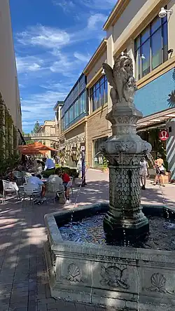 Capwell's became Emporium-Capwell in 1979,[10] and was converted to Macy's in 1995;[11] while I.Magnin was converted to a separate Macy's Men's store that same year.[12] A renovation occurred at the property in the early 1990s, adding a unified architectural and landscaping scheme to the property when it previously had none. Crate & Barrel opened a two-level store at the property in 1992. A former parking lot adjacent to Crate & Barrel was replaced with a pedestrian plaza in 1994, with a fountain, a retail building, and a stand-alone California Pizza Kitchen restaurant. Finally, a new, multi-floor parking structure was built in the southwest corner of the property behind the Macy's Men's store.